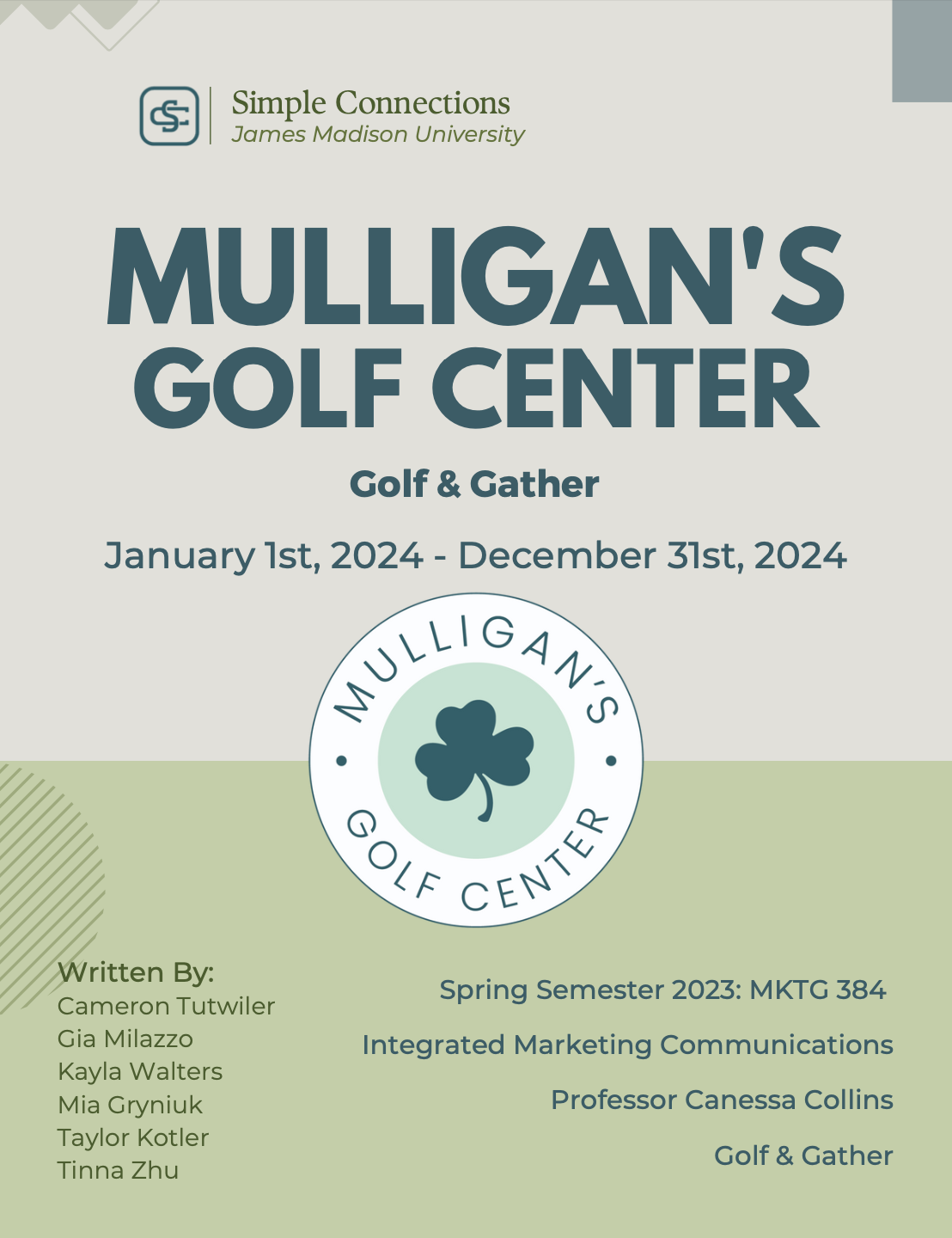 One of my favorite classes I’ve taken as a Marketing student has been my Integrated Marketing & Communications class. In this class we were assigned to create a unified plan for Mulligan’s Golf Center, a local business looking to revamp brand and marketing efforts. My agency of 6 students, called Simple Connections, conducted industry & consumer research to put together a guide for the golf center. This spanned from competitive reviews, buyer analyses, brand guides, media plans & budgeting, and specific campaign ideas. You can check out the executive summary I put together on pages 4 & 5 for a general overview of plans.